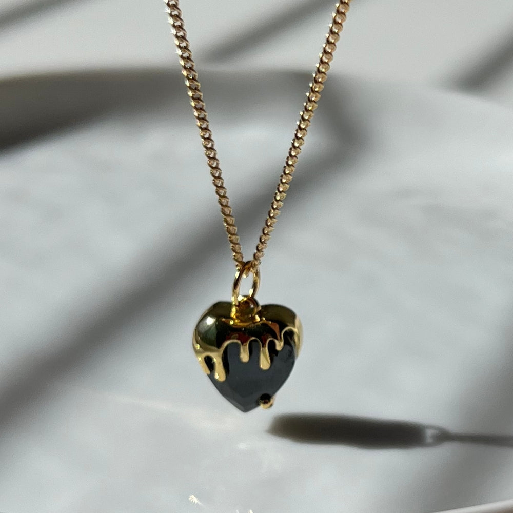 Make a bold statement with our Black Heart Necklace, featuring a sparkling CZ pavΓ© heart pendant wrapped in a modern gold-filled drip design. Suspended from a 14K gold-filled cable or curb chain, this piece combines edgy style with refined details β making it the perfect necklace for expressing love with a twist. The black cubic zirconia stone adds a dramatic sparkle, while the gold-filled coating over the heart gives it an artistic, one-of-a-kind look. Designed for everyday wear or special occasions, this black heart pendant necklace is a standout piece on its own and layers beautifully with your favorite chains. Crafted with quality, tarnish-resistant 14k gold-filled materials, this necklace is made to shine and made to last β perfect for gifting or elevating your own jewelry collection.