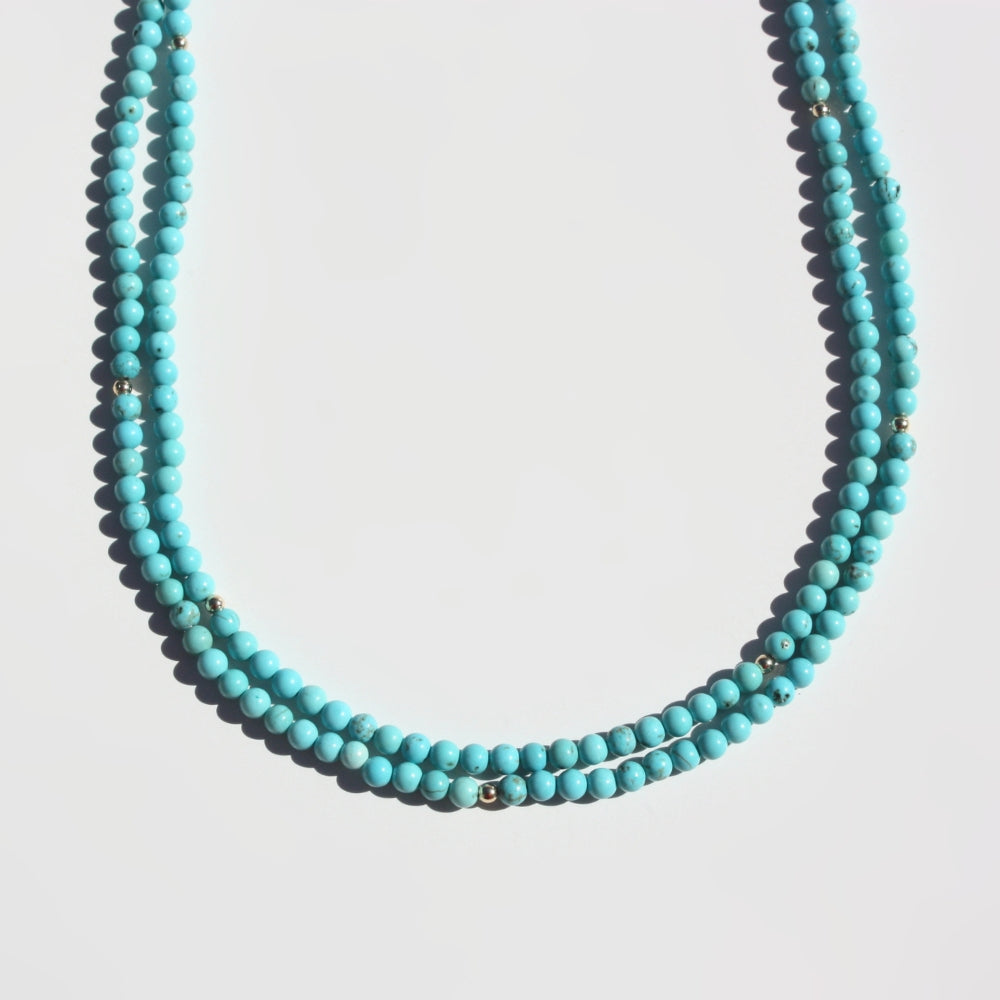 Elevate your style with our Turquoise Magnesite Beaded Necklace, crafted with premium 14k gold-filled components. This versatile long necklace offers the stunning look of genuine turquoise at a fraction of the cost. Designed to wrap around your neck, it creates multiple layering possibilities, allowing you to customize your look for any occasion. The perfect statement piece that combines luxury appearance with exceptional value.