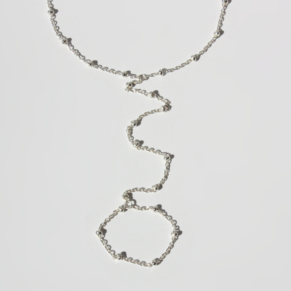 Add a touch of sophistication with our Hand Chain Bracelet Silver. Made with sterling silver and detailed with sterling silver beads, this versatile accessory can be worn alone or stacked with rings and other bracelets for a unique look. Elevate your style game effortlessly with this must-have piece. (Stack alert!)